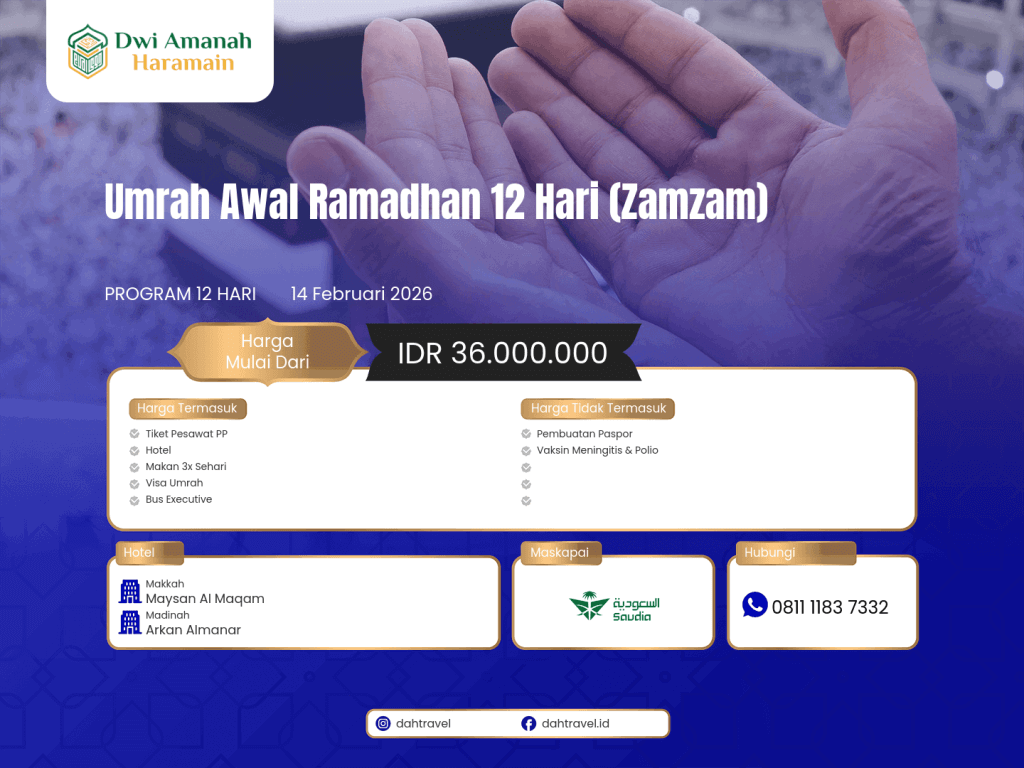 - Penetapan dan Perubahan tanggal keberangkatan sepenuhnya kewenangan PT. Dwi Amanah Haramain kecuali untuk keberangkatan umrah by request.