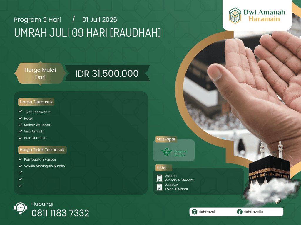 - Penetapan dan Perubahan tanggal keberangkatan sepenuhnya kewenangan PT. Dwi Amanah Haramain kecuali untuk keberangkatan umrah by request.
